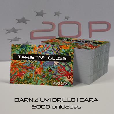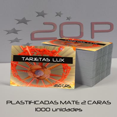Tarjetas impresas a todo color por ambas caras en papel couche 350 grs a tamaño 8,5 x 5,5 cm + plastificado mate ambas caras. Mínimo 1.000 por modelo. Impresión Offset en plancha conjunta.